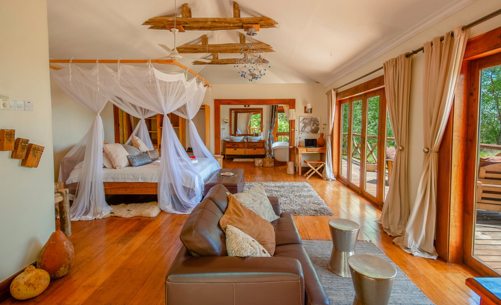Die Lodge verfügt über stilvoll eingerichtete Zimmer, die afrikanisches Design mit modernem Komfort verbinden. Zur Ausstattung gehören: